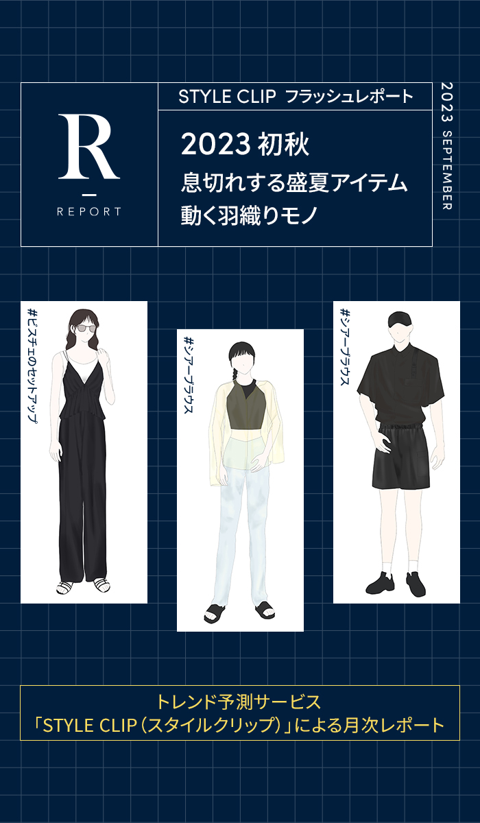 株式会社アパレルウェブが月別にEC売れ筋情報をお届けする「スタイルクリップ」フラッシュレポート。2023年10月のレポートでは、晩夏・初秋シーズンである9月4日~10月1日のEC売上データから、どのようなアイテムが売れ筋となったのかをレポートします。