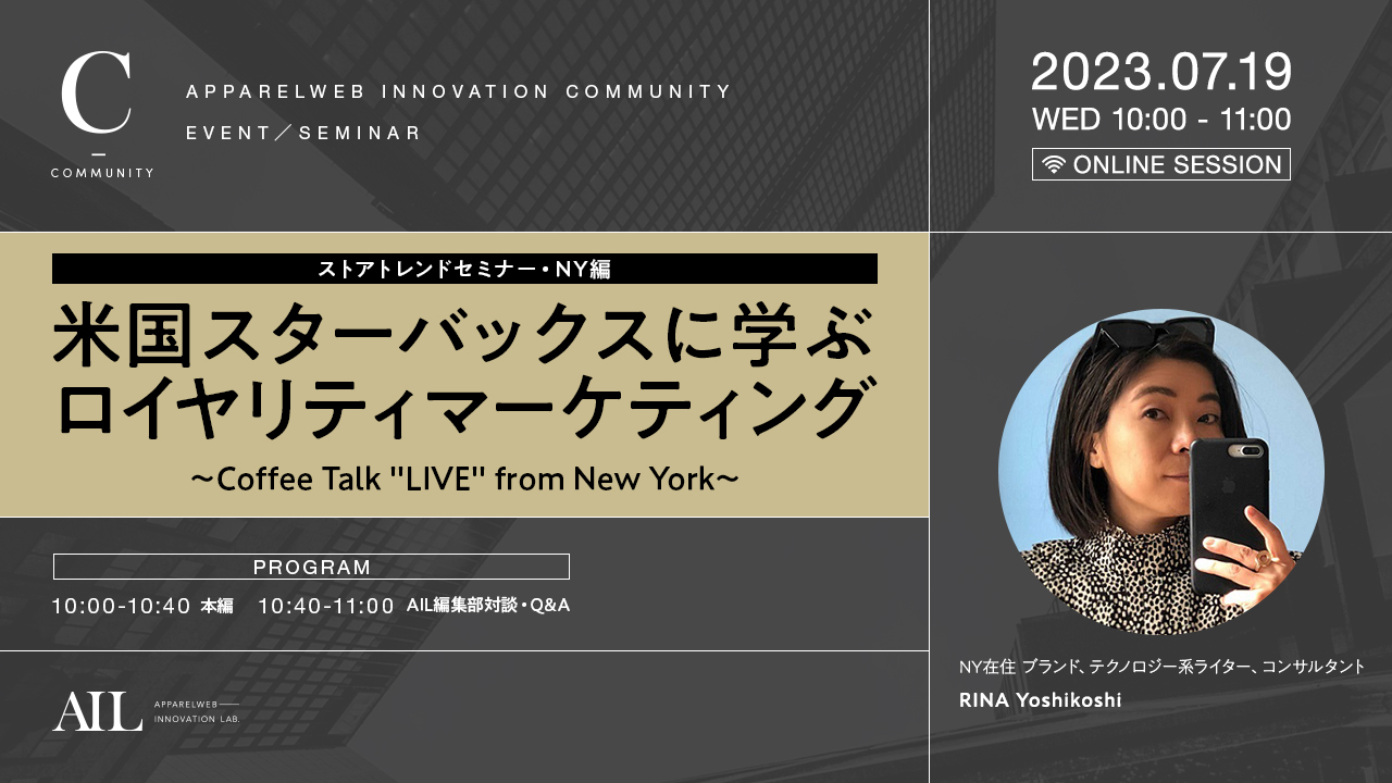 ゲストスピーカーには、ニューヨークを拠点にブランド・リテール市場調査や最新テクノロジー導入店舗研究、マーケティング・執筆を行うAILメディアパートナーのRINA氏を招き、各サービスの説明や実体験をAIL編集部との対談も交えてお届けしていきます。