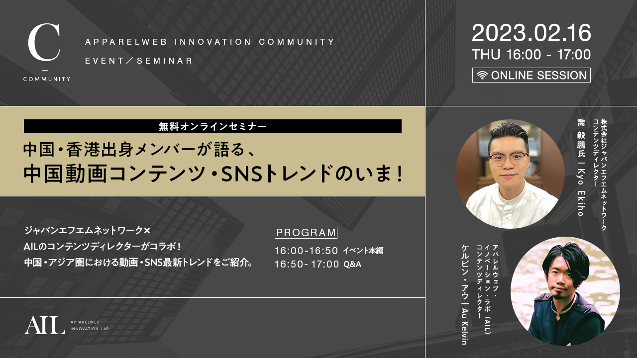 スピーカーは、「抖音」で10万人のフォロワーを保有した経験を持つ、自身もインフルエンサーとして活躍するジャパンエフエムネットワーク 中国出身コンテンツディレクターの喬(キョウ)氏と、AIL編集部の香港出身コンテンツディレクターのケルビン。現地市場を熟知する2名の視点で、「中国・アジアマーケティング」に役立つリアルな情報を出来る限りお伝えしていきます。