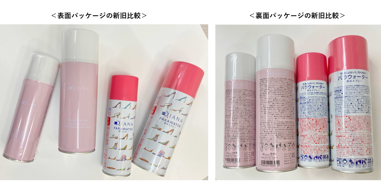 「防水スプレー」の表裏の新旧パッケージ比較画像。いずれも左がリニューアル商品、右が従来商品。
