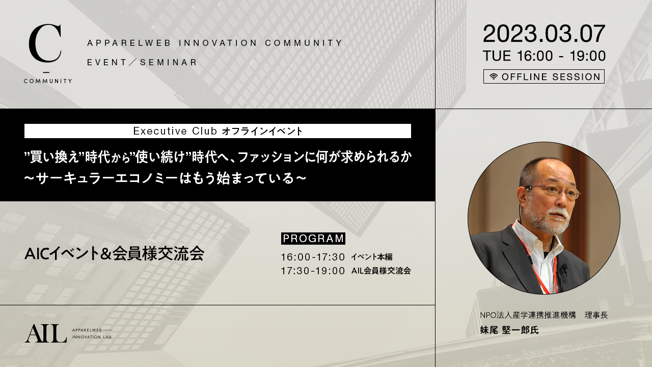 Community 【満員御礼】3/7(火)開催 リアルセミナー&会員様交流会 お申込を締切いたしました 2023.02.28 AIL運営事務局 Tweet Topics一覧はこちら セミナー詳細はこちら ※本イベントはAIL会員様限定となります ※お申込には「AIL会員」ログインが必要となります ※定員となりましたのでお申込を締切いたしました(2023.3.2) Tweet 【スタイルクリップ|フラッシュレポート】2023年冬春商戦 防寒アウター分析 3月8日開催「2023 パリ国際ランジェリー展」トレンドセミナー|AIL会員様特典あり