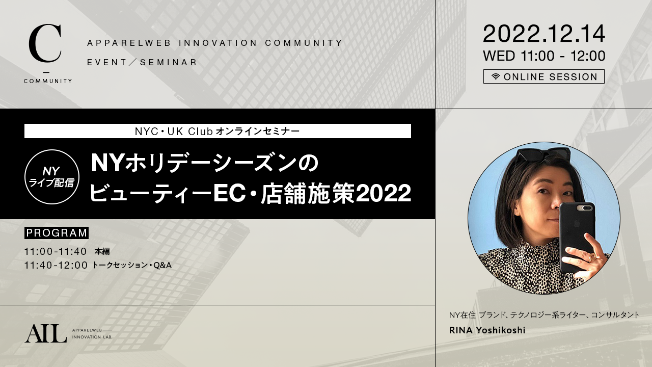 AILが配信するオンラインセミナー。人気企画NYライブ配信。アメリカ・ニューヨーク現地パートナーとライブ配信で、2022年の米国ホリデー商戦について、EC・店舗両面からリアルタイムレポートをお届け。