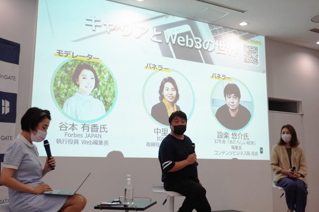 「キャリアとWeb3の世界」をと題したテーマでは、幻冬舎「あたらしい経済」の編集長でコンテンツビジネス局局長の設楽 悠介氏と、Institution for a Global Society株式会社取締役事業・開発統括の中里 忍氏が登壇しました。冒頭では、設楽氏から昨今のWeb3業界の注目のトピックを解説。その後Web3によって、教育や仕事、社会がどう変わるかという議題について掘り下げていきました。