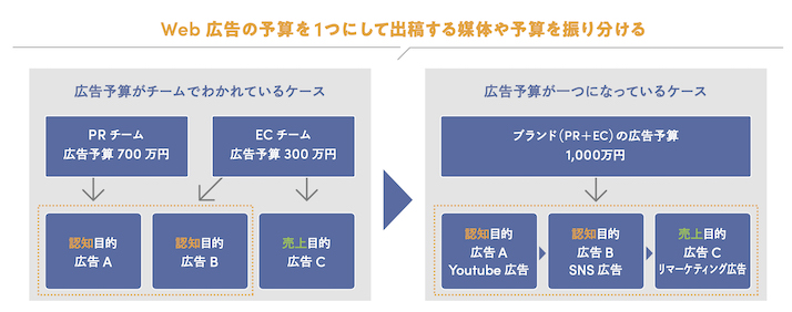 しかし実際の問題として多いのが、「購買を目的としたEC用の予算」と「認知を目的としたPR用の予算」に予算が分けられていることです。理想はWeb広告の予算を一つにした状態から、認知や購買のための媒体や予算を振り分けていく形。というのも、マーケティングチームとECチームがあるとして、マーケティングチームの広告予算700万、ECチームの広告予算300万円とすると、それぞれからWeb広告や販促費用を振り分けているケースが多いのです。