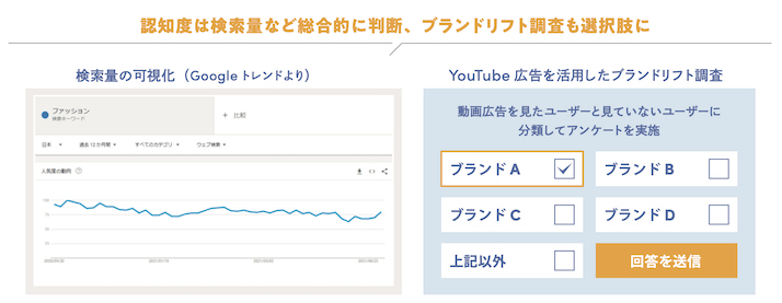 また別の手法ではYouTube広告を活用したブランドリフト調査があります。これはGoogleがブランドのYouTube広告を見たユーザーと見ていないユーザーに対して、認知に関するアンケートをする調査です。「YouTube広告の結果、広告を見たユーザーと見ていないユーザーを比較して○○%認知度が高い」という結果で示されます。