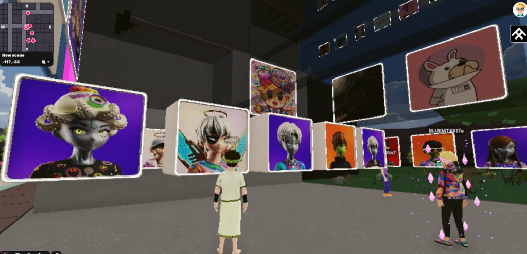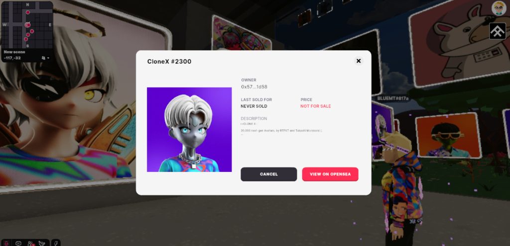 建物は仮想現実なのでなんでもありです。とにかくコンセプトとインパクトを重視したデザインになっています。ギャラリーでは、ブランドのECサイトに直接移動して商品を販売しているものや、話題になった「cloneX」のようなアイコンのNFTを現実のアートギャラリーのように空中や壁に展示して販売していることがほとんどでした。