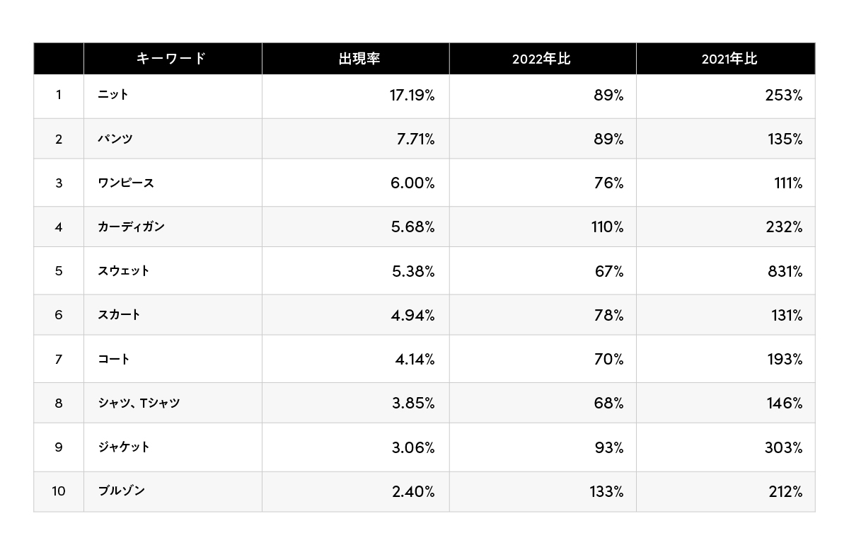 株式会社アパレルウェブが月別にEC売れ筋情報をお届けする「スタイルクリップ」フラッシュレポート。今回は、2023年1月3日~1月29日のEC売上データから、どのようなアイテムが売れ筋となったのかをレポートします。