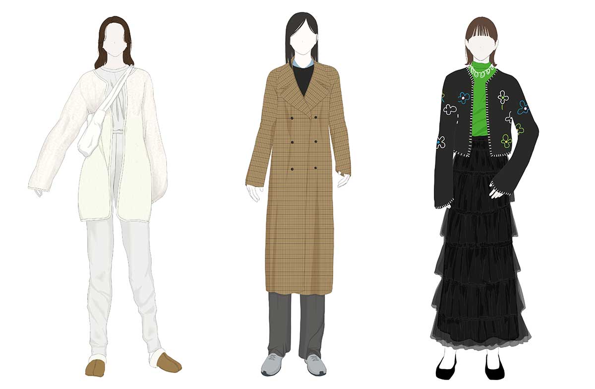 左から、エアリーコーデ、マスキュリンルック、古着ミックス