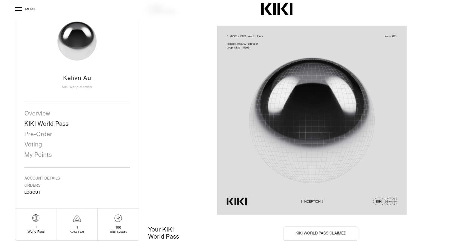 まず1点目、NFTを活用したデジタル会員証と会員管理の仕組みですが、同ブランドの公式サイトでは、電話番号、メールアドレス等を入力して会員登録を完了すると「マイアカウント」というユーザーページが表示されます。ユーザーページに入ると、「KIKI World Pass(キキ ワールド パス)」という、ブランドのメンバーシップ機能が表示されます。初回登録後、「KIKI World Pass(キキ ワールド パス)」の機能より「会員証を発行(Claim)」というボタンをクリックすると、読み込みが開始されブランドのオリジナルNFTが付与されます。これがデジタル会員証の役割を果たします。
