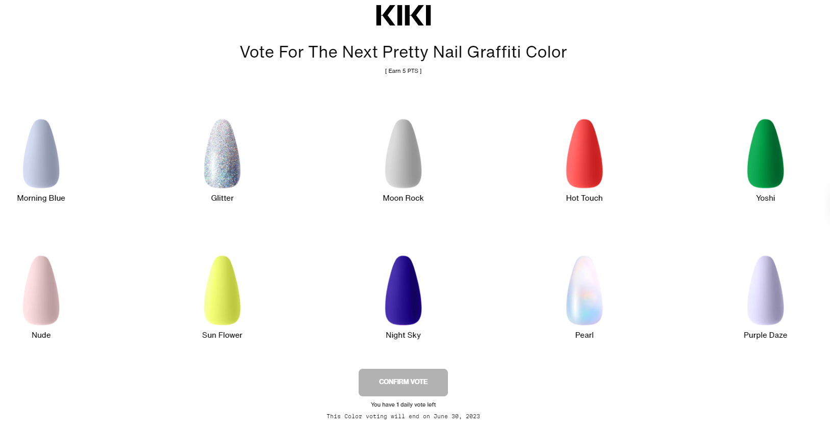 試しに、「Nail Graffiti Color(ネイルカラー)」のカラー投票をしてみました。まず、この「投票行為」そのものがブランドへの貢献とみなされ、投票後はデジタル会員証を介して「KIKI points」という、いわゆるリワードポイントが還元されます。付与されたポイントはショッピングに使用できます。