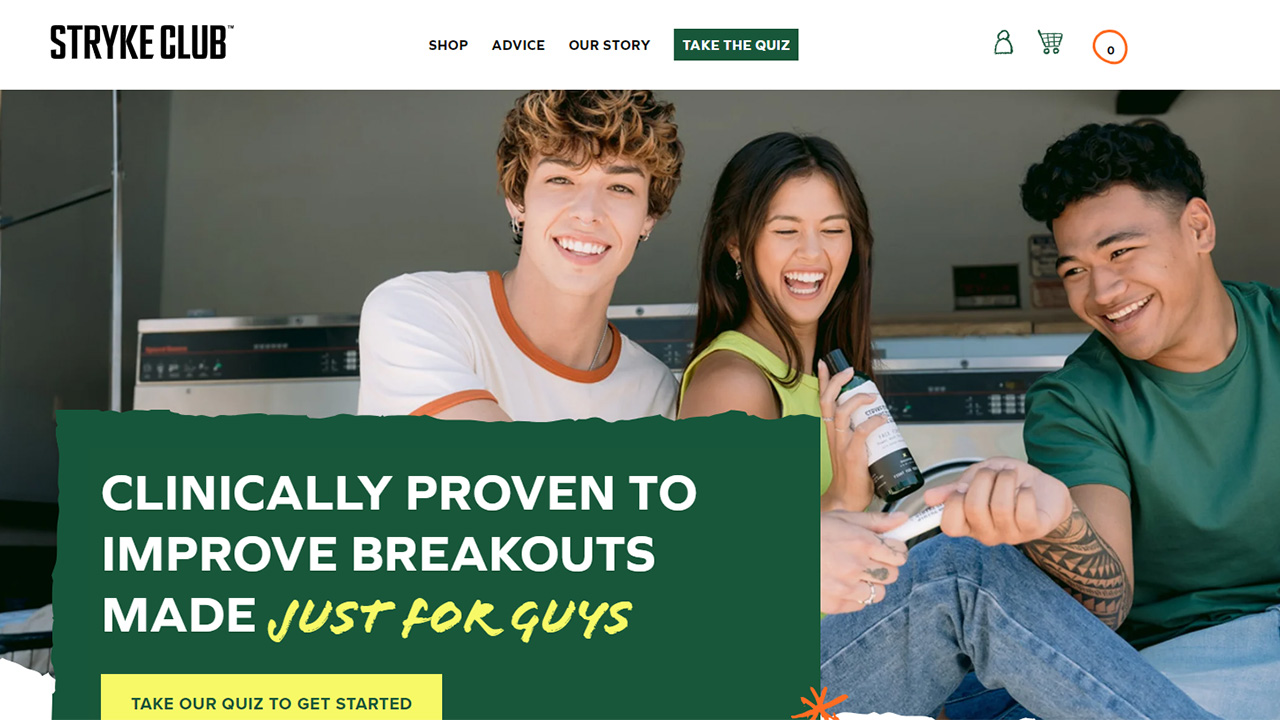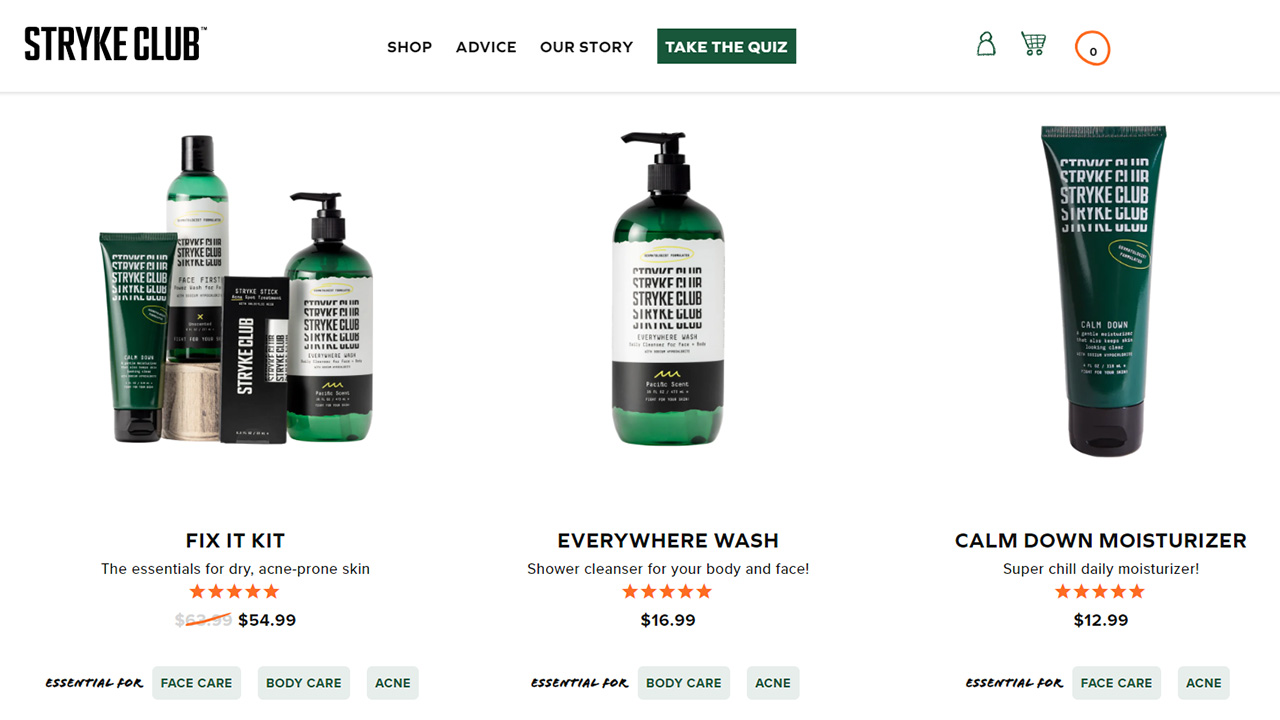 また「Stryke Club」では、ニキビなどの原因別の肌トラブルを解決する商品開発に特化しています。ECサイトでは、ユーザーのライフスタイルに対するアンケートを実施し、パーソナライズした商品をレコメンドするなどの工夫が施されています。また価格設定としては、多くの商品を20ドル以下に設定。さらに学生割引も実施し、手頃な価格面で新規顧客獲得に注力しています。