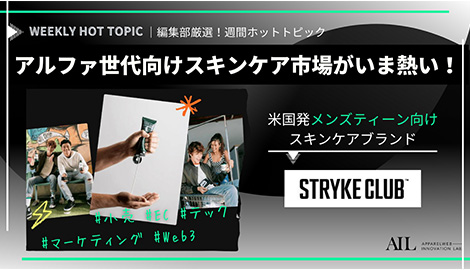 小売、EC、マーケティング、テック、Web3カテゴリーを中心に、今週注目を浴びた国内外の最旬情報をお届け。今回は、10歳~13歳のアルファ世代に向けたスキンケアとして注目が集まる、 米国発メンズティーン向けスキンケアブランド「Stryke Club」をピックアップ。