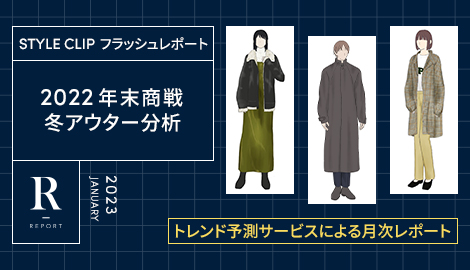 株式会社アパレルウェブが月別にEC売れ筋情報をお届けする「スタイルクリップ」フラッシュレポート。2023年1月は、2022年11月28日〜2023年1月1日のEC売上データから、アウターの実需期においてどのようなアイテムが売れ筋となったのかをレポートします。
